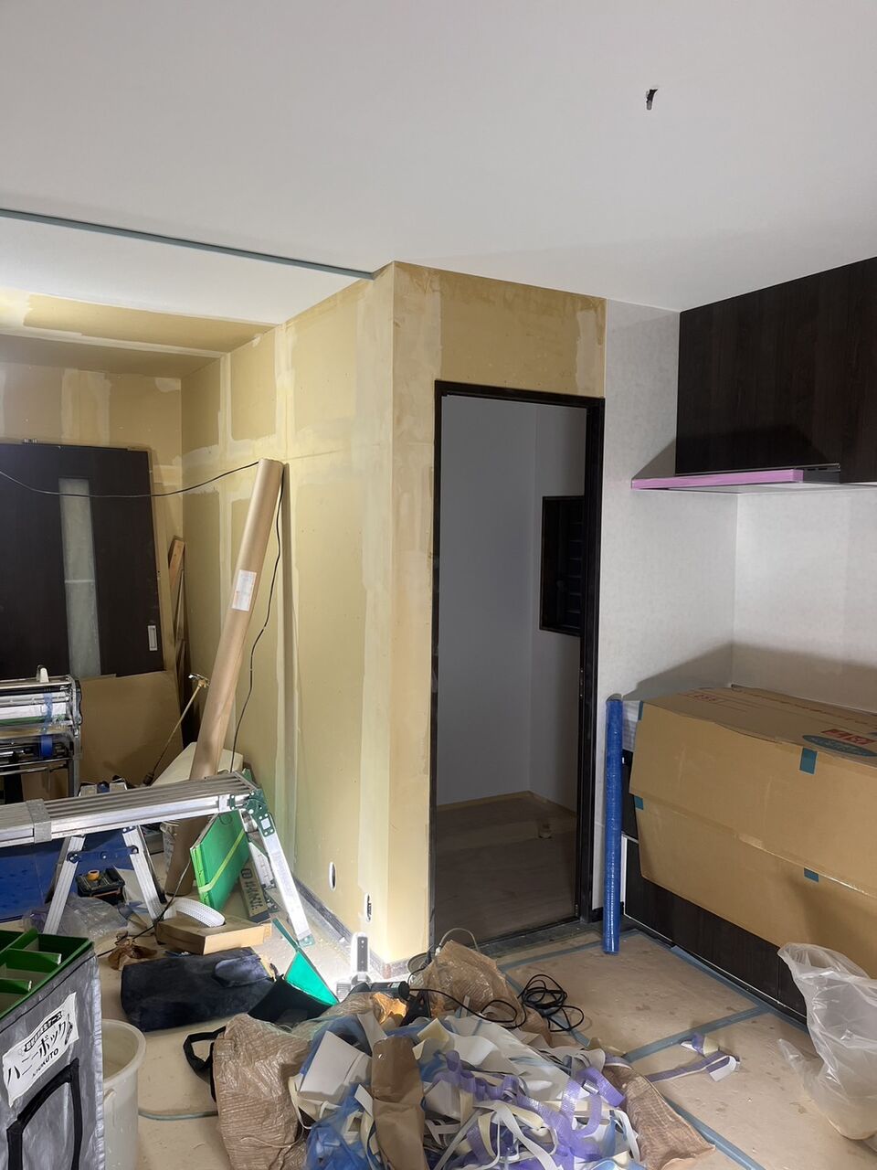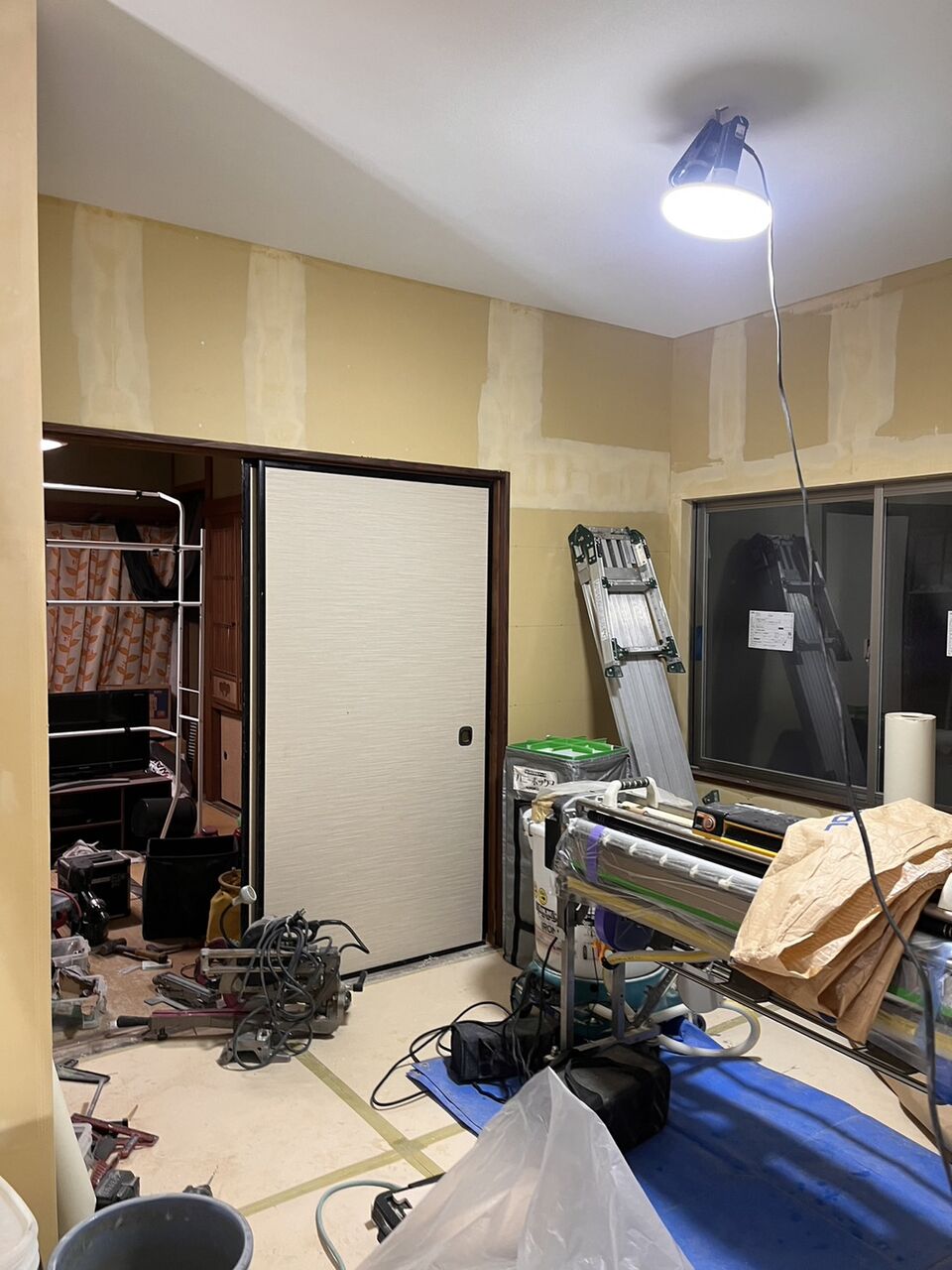 今日は既存の壁にベニヤ板でクロス用の下地を行いました