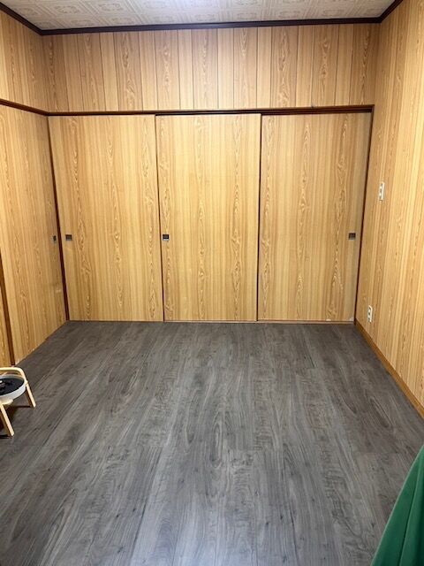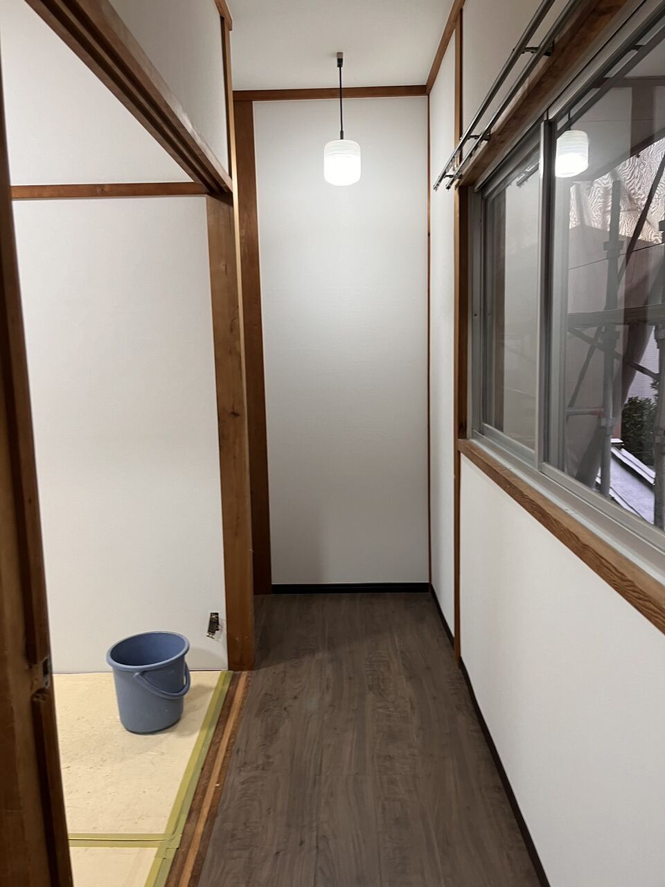 床を貼り替えた洋間と改装工事中の和室の様子です