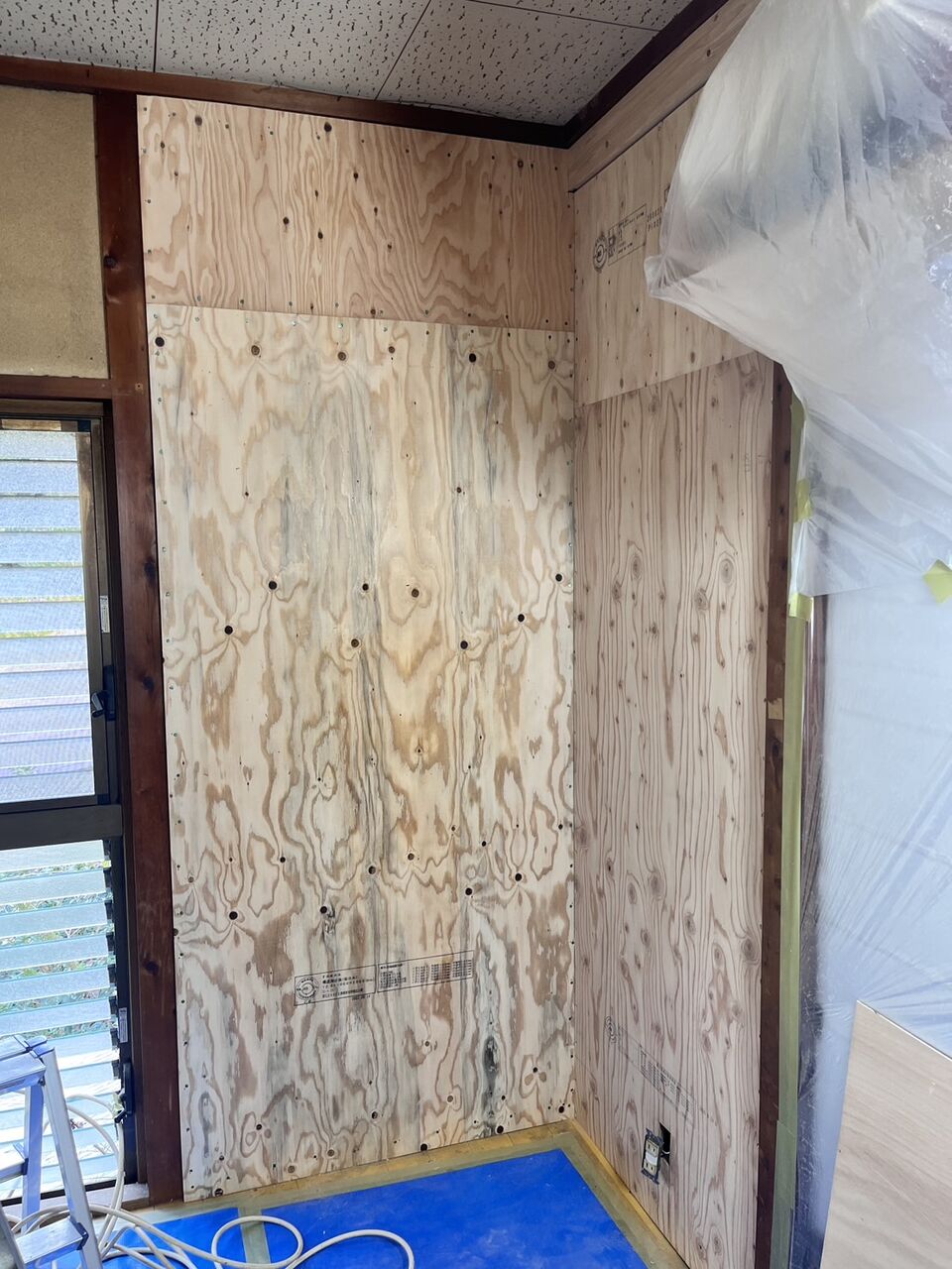 耐力壁が仕上がったのでクロス工事用にベニヤ板で下地を行いました