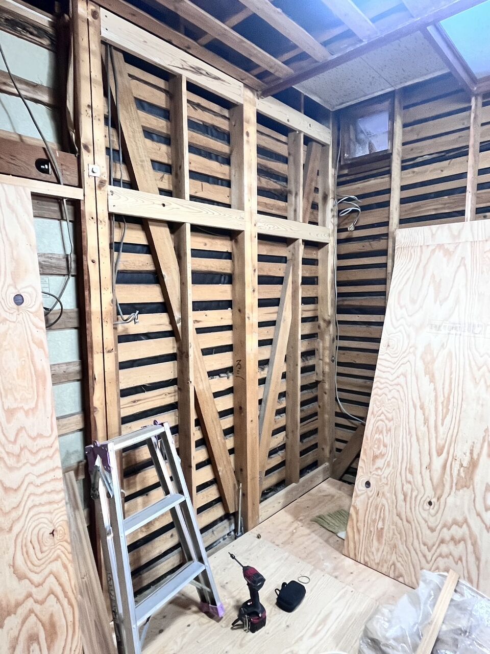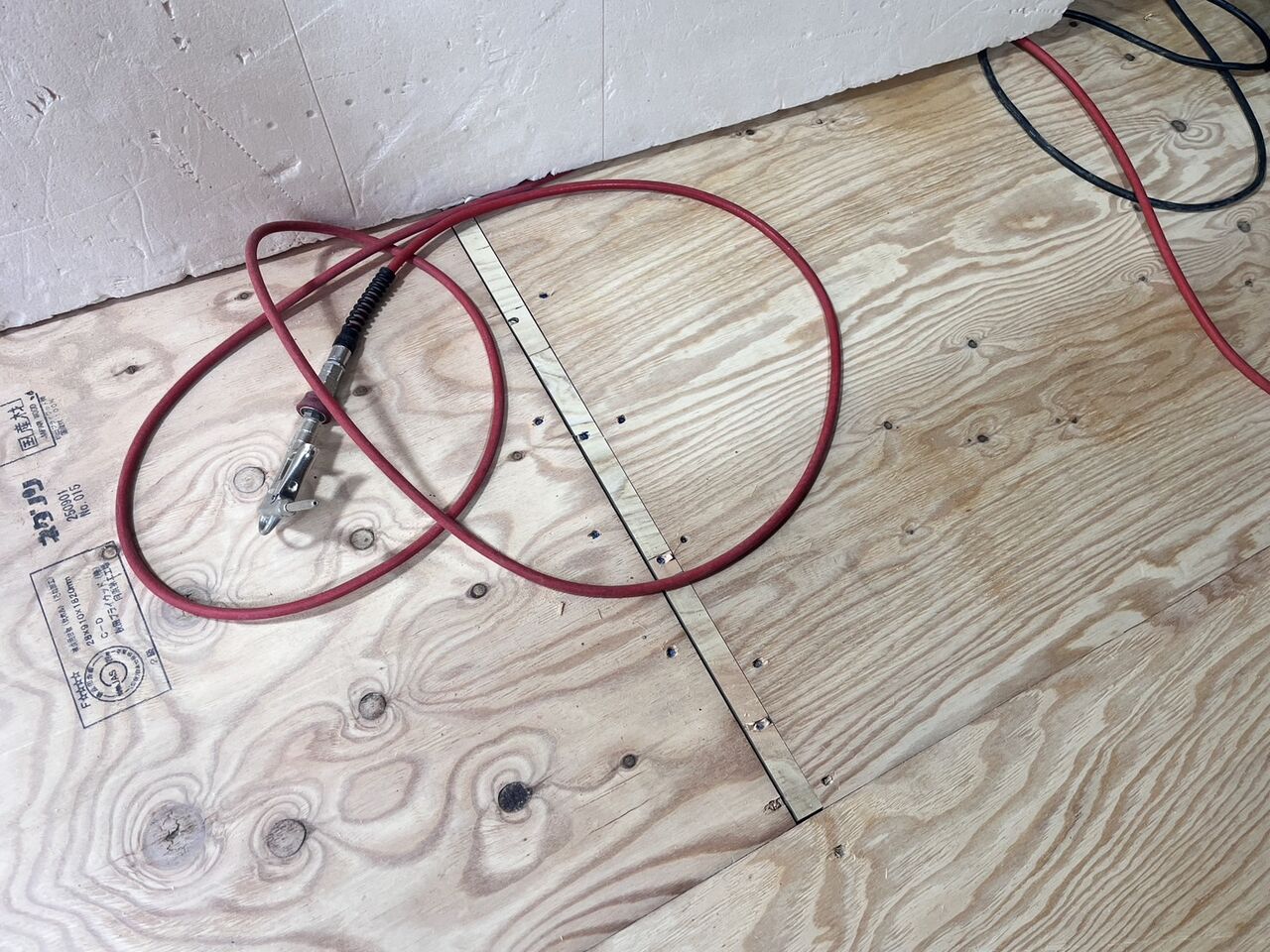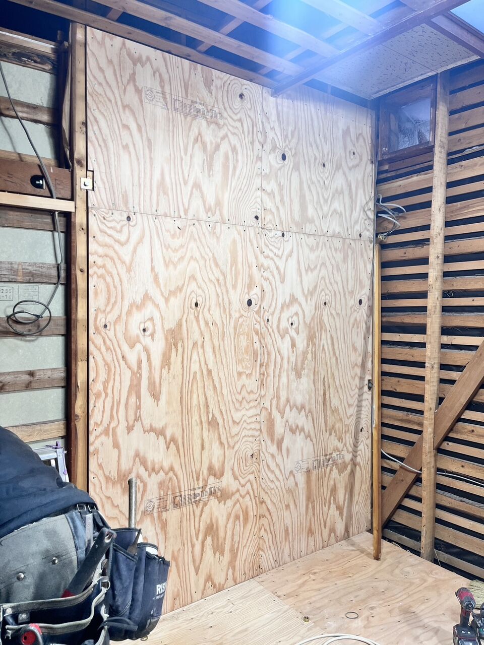 床が上がったので、耐力壁下地を行って針葉樹合板で耐力壁を仕上げました