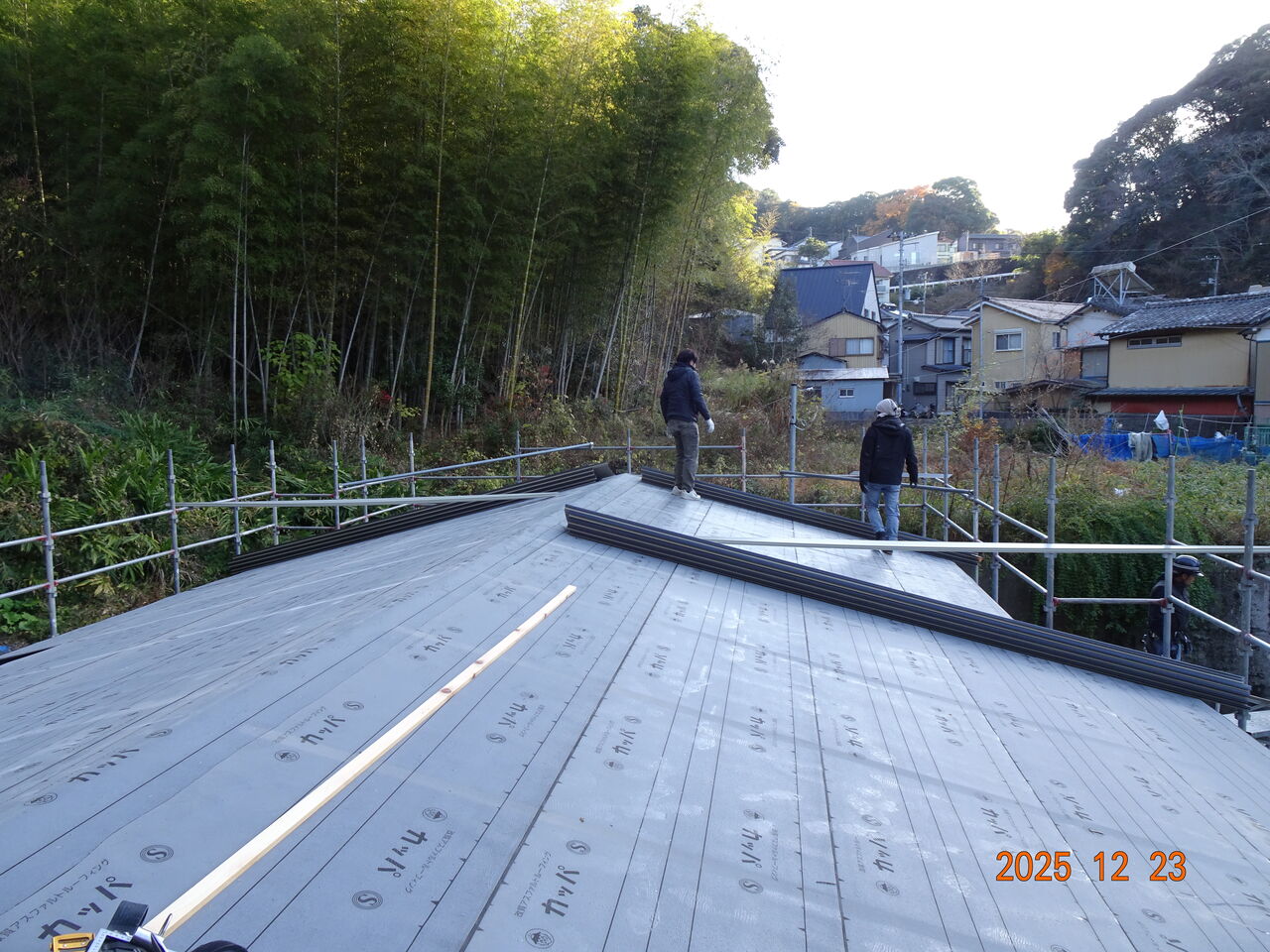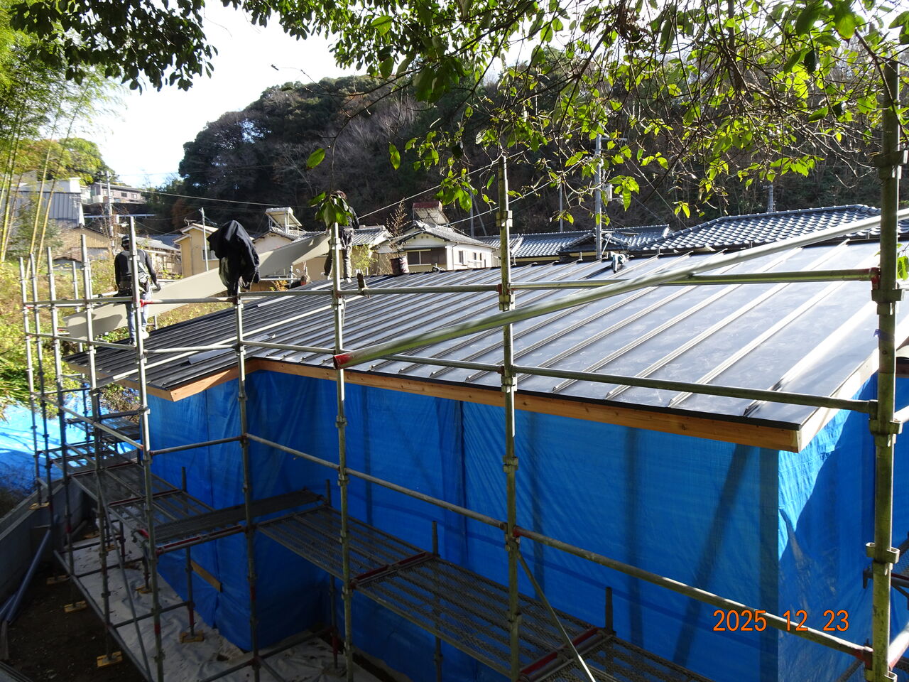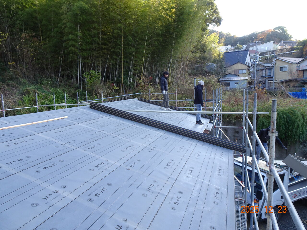 夕方になって又寒くなってきました朝も寒いですが夕方から先も寒いですね予定通り新築工事現場で屋根葺き工事を行いましたお昼の段階でこんな感じでした残ったら明日仕舞に来るという事でした先ほどlineが来て「屋根工事完了しました」との事でした若い職人さんが大勢いたので仕事早いですね明日は朝から設備工事を予定しています朝は全く陽ざしが無い現場なので、せめて気温が高いと有難いですがでは皆様、本日も一日お疲れ様でした 人気ブログランキング ↖バナーをポチッとお願いします