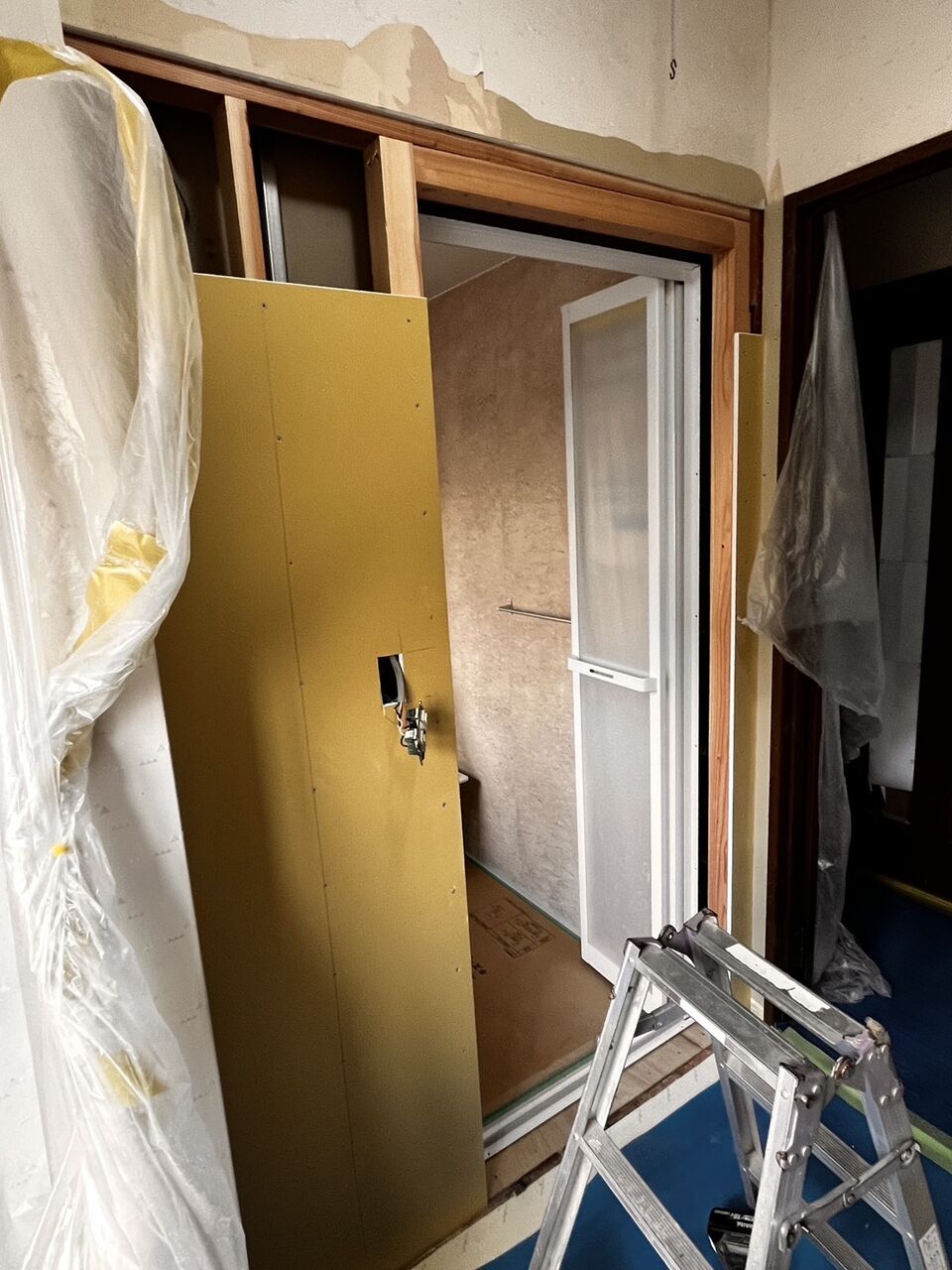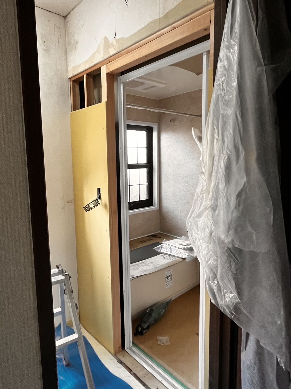 昨日ユニットバスの設置が終ったので、今日は洗面所と浴室の教会の壁を