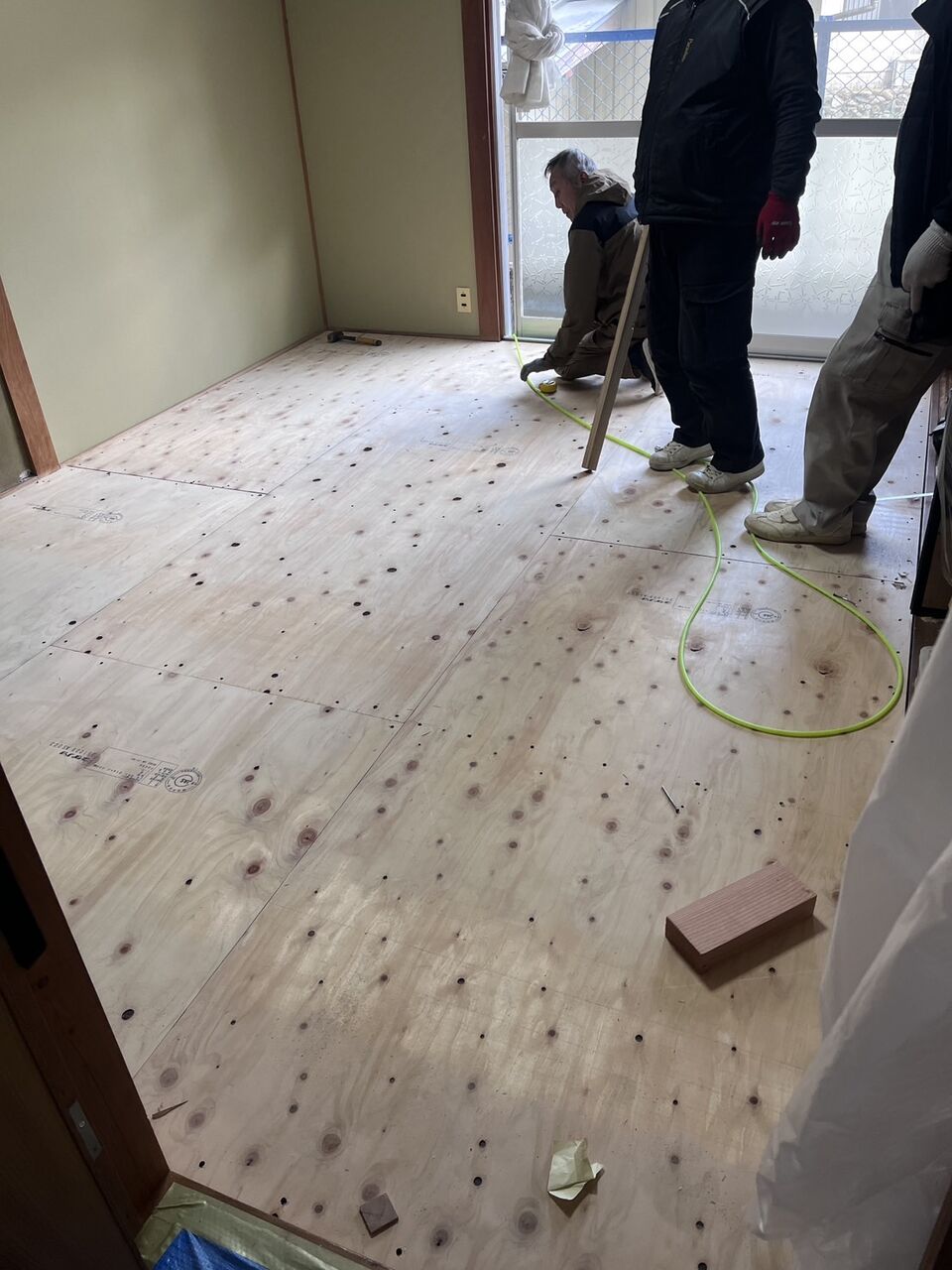 壁にベニヤ板を貼ってクロス工事を行うので、フロアー合板を貼る前に先に